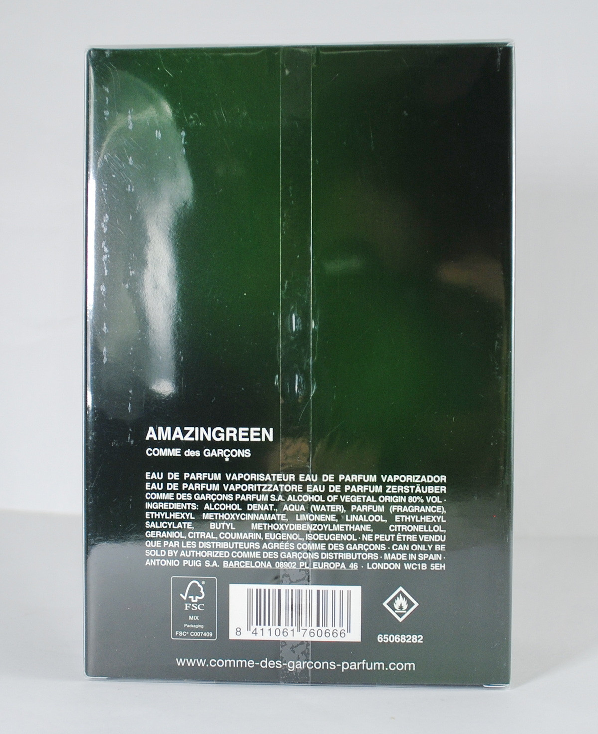 Неймовірно свіжий, як крапельки дощу, весняно-літній аромат Comme des Garcons Amazingreen перенесе в райське місце. Це зухвалий і неприборканий парфум, у ньому є нюанс пороху, запалом для якої може послужити зустріч двох протилежностей. Теплота прянощів починає віддавати мокрим пальмовим листям, пахощами свіжої зелені та запашного зеленого перцю.