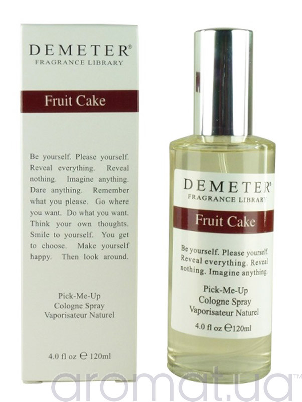 Фантастичний аромат фруктового тістечка в туалетній воді Demeter Fruit Cake залишить найкращі спогади. Парфум простий і неповторний, у ньому поєднуються тони стиглої пшениці та сухофруктів, які дають такий дивовижний результат. Творіння можна назвати простим і від цього геніальним, у ньому гламурного блиску та непотрібної томності, їх замінює стиль та справжній настрій, який тепер буде з вами завжди.