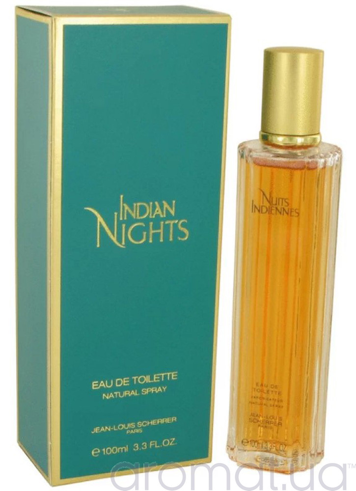 Класична туалетна вода 1994 року випуску Jean-Louis Scherrer Indian Nights, це поєднання багатьох компонентів, що створюють єдиний ароматичний союз. Авторам вдалось зробити своєрідне посилання до минулих часів, але водночас витримати роботу у сучасній формі. Спершу нас зустрінуть альдегіди та фруктова начинка, поєднана з тонами персика та мандаринового відлуння.
