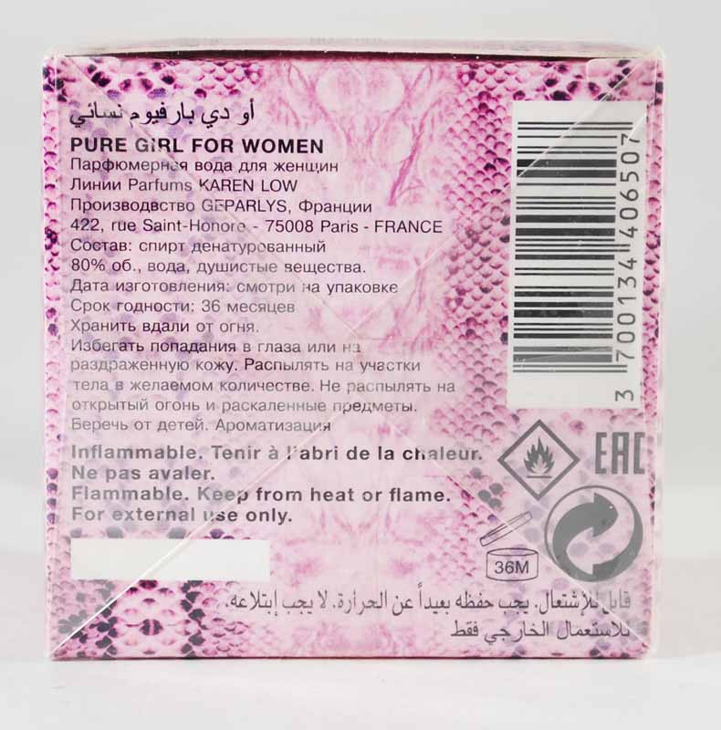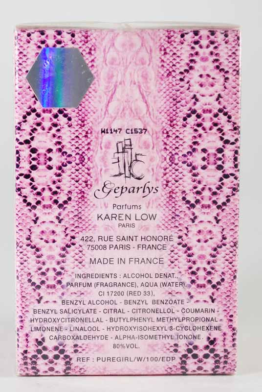 Пудровый и цветочный аромат Karen Low Pure Girl ориентирован на молодых, современных девушек, обожающих купаться в мерцании своего совершенства. Стильный аксессуар для смелых и сильных. Открываются ноты карамельным покровом розы, сочным боярышником и необыкновенной смородиной, после чего переходит в сердце, затрагивая самые чувственные капли, благодаря арабским компонентам. Аккорд базы завершает штрих тонким взлетом гедиона, наполненной магией вечного цветка циклозаль. При всей скромности данная пирамида отвечает высоким запросам времени, перед ней нет преград и условностей, как и перед вами, так что вперед, к приключениям и конечно необузданной страсти.