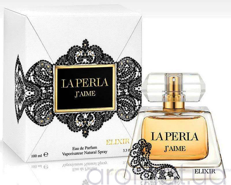 Продовження знаменитого сімейства ароматів, яке отримало назву La Perla J'aime Elixir, носить такий же глибокий і багатогранний характер, як і знаменитий попередник. У початкових нотах композиція розкривається на контрасті цитрусової свіжості мандарину та яскравої таємничості бергамота, притушеному арабськими акордами чорного перцю.