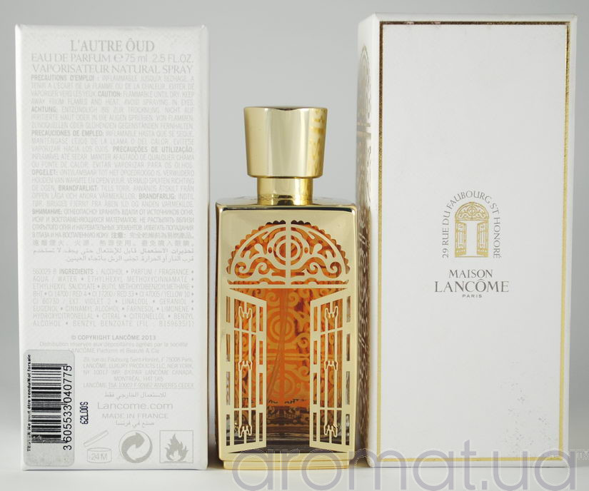 Парфумовану воду Lancome L'Autre Oud, важко порівнювати з чимось. На відміну від штампованих творів це шедевр для знавців парфумерії. Кожен елемент розставлений на місце і відіграє особливу роль. Спочатку зустрічається розкішна квітка іранського шафрану та букет з лабдануму, увінчаного класичною шавлією. Піраміда поміщена в елегантний флакон, у центрі якого зображено ворота.