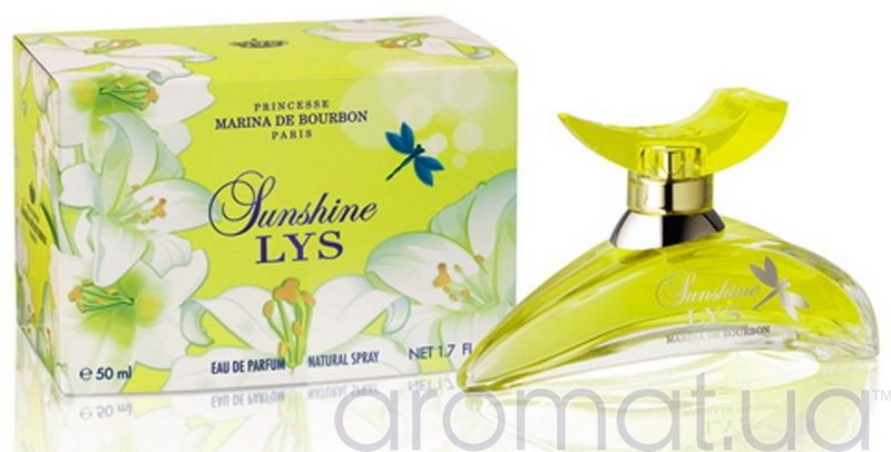 Зворушливий квітково-фруктовий аромат Marina de Bourbon Sunshine Lys, поміщений у флакон, що повторює витончений силует граціозної лілії, гармонійно продовжує імениту колекцію для чарівних і чудових жінок, що тонко відчувають навколишній світ. Перші нотки відкривають яскравий лимон, найніжніший лист фіалки та водяний гіацинт, передаючи естафету серцевій ноті з її ароматною полуничкою, єгипетським жасмином та конвалією.