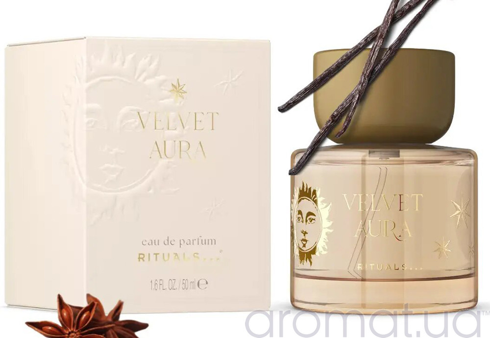 Rituals Velvet Aura — новинка 2025 року, аромат, що розкриває себе як оксамитова тінь зі світлими іскрами спецій. Відкривається він теплим кардамоном і терпкими листям гвоздики, які створюють пряну ауру, насичену глибиною і загадковістю. Бергамот додає яскравого сяйва, знімаючи густоту спецій і надаючи аромату легкого цитрусового подиху. Зірчастий аніс вносить магічну прохолоду, ніби орнамент нічного неба, який підсилює містичність композиції. Aromat.ua У серці оживає ніжне неролі — світле, квіткове, воно створює м’який баланс, даруючи аромату витонченості. Далі вступає награмота зі своїм смолистим, гіркуватим характером, додаючи відчуття ритуальної глибини. Завершує звучання коріння ірису: пудрове, шляхетне, воно огортає композицію аристократичним шлейфом