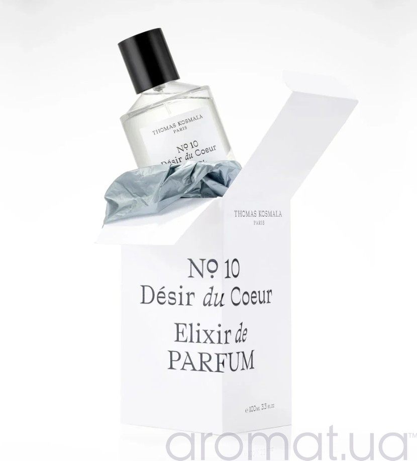 Парфум No.10 Désir du Coeur Elixir de Parfum від Thomas Kosmala — це вишуканий і чуттєвий аромат для чоловіків і жінок, який належить до категорії східно-деревних парфумів. Створений у 2023 році, цей еліксир є посиленою версією класичного No.10 Désir du Coeur, що вирізняється потужною стійкістю та інтенсивним шлейфом. Аромат відкривається свіжими та легкими нотами, які поступово переходять у глибокий, землистий акорд пачулі, що домінує в композиції. Молекулярна структура парфуму дозволяє йому розкриватися унікально на кожному, створюючи індивідуальний ароматичний профіль.